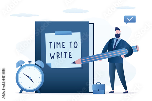 Time to write, smart businessman or student holds pencil and notepad writing down lecture plan, blog or keeping diary. Writer or blogger uses notepad or book for work.