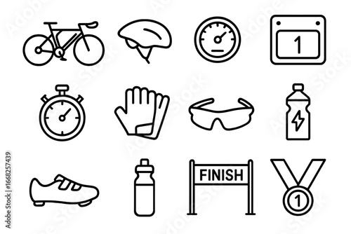 Time Trial Icons. Outline icon set of time trial cycling: aerodynamic bike, helmet, speedometer, race number,