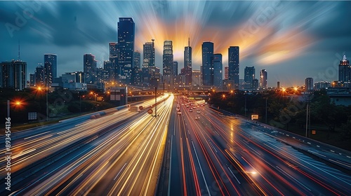 Timelapse of highway traffic with city skyline in the background. The long exposure captures the dynamic light trails of vehicles. A modern urban landscape. Generative AI.