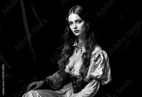 elegance, portrait, monochrome, woman, beauty, artistry, confidence, fashion, historical, dramatic, coiffure, accessory, jewellery, captivating, serene, contrast, paint, chiaroscuro, expression, pose, allure, classic, sophisticated, aethereal, romance, vintage, femininity, stylistic, intimacy, detail, light, shadow, gaze, aesthetic, inspiration, graceful, historic, lustrous, emotion, luxurious, creativity, generative, ai