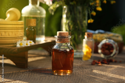 Tincture in bottles, different ingredients, mortar and pestle on wooden table outdoors