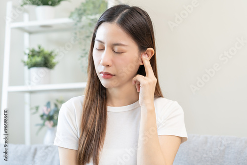 Tinnitus concept, sick asian young woman, girl have ear pain or earache, hand touch plug ear, suffering painful otitis from loud of noisy sound, inflammation. Health care nerve deaf eardrum disease.