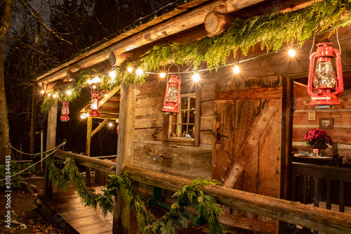 Tiny and Cozy house Cabin Exterior with Christmas lights. Ideal picture that brings up holiday spirit.