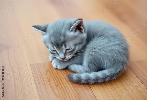 Tiny blue kitten curled on wood floor, adorable fluffy paws, lovely, animal