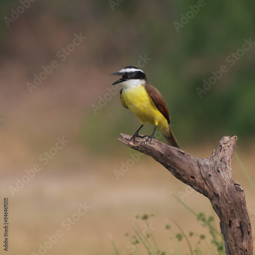 Tiny Great pitanga (Pitangus sulphuratus) with a yellow chest perched on a branch