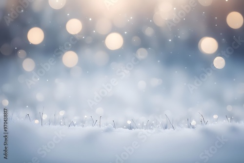 Tiny white bokeh sparkles floating softly over a blurred winter wonderland scene, AI Generated