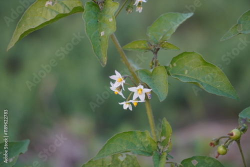 Tiny white nightshade flowers in close up with a blurry background