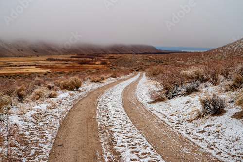 tire tracks in snow on brown desert road in Eastern Sierra Nevada mountain valley winter landscape in California