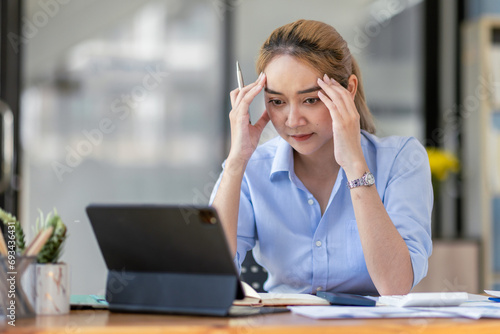 tired business asian woman sleepy and bored from sitting at a desk for a long time and has office syndrome feeling sick at work, copy space