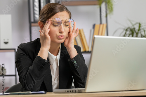 Tired ill Caucasian business woman suffering from headache problem tension and migraine stress at home office desk workplace. Pretty freelancer broker worker girl works on laptop notebook. Overworking