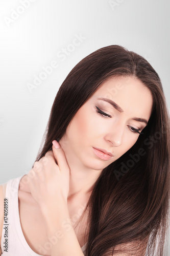 Tired Neck. Beautiful Young Woman Suffering From Neck Pain. Attractive Female Feeling Tired, Exhausted, Stressed. Girl Massaging Painful Neck With Hand. Body And Health Care Concept. High Resolution