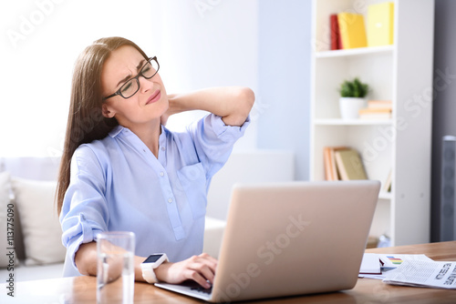woman, beautiful, to sit, table, sleepy, neck, laptop, always, connected, closeup, indoor, contemporary, touch, single, pleasant, surface, pain, rest, office, hand, face, life, modern, digital, person, white, female, bruised, men at work, style, casual attire, mood, daytime, light, concept, technology, tied-up, colours, stylish, goggles, alone, cheerless, brunette, caucasian, device, shirt