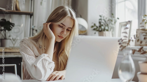 Tired young woman sitting at laptop