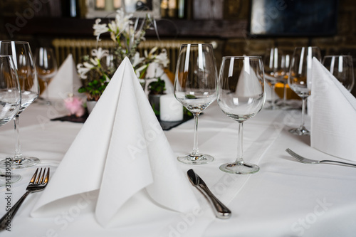 table, eatery, dinner, wedding, glasses, setting, banquet, party, napkin, plate, decoration, white, catering, celebration, tablecloth, food, wine, event, reception, lunch, luxury, fork, flatware, place, interior, facility, furnished, modern, plant, flower, coffee
