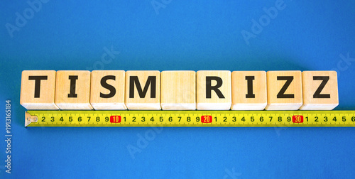 Tism rizz symbol. Concept word Tism rizz on beautiful wooden blocks. Beautiful blue background. Beautiful yellow ruler. Business education support tism rizz concept. Copy space.
