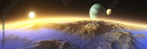 Titan (satellite of Saturn) at sunset, panorama of the red planet at sunrise, the surface of an alien from space, 3d rendering
