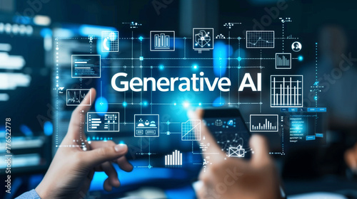 Title: "AI Integration" Art Description: A person holding an Generative AI logo surrounded by data visualizations and icons, representing the integration of artificial intelligence in business.
