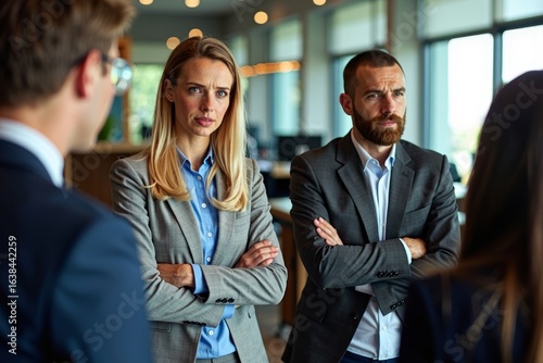 Title: Anxious job seekers from various backgrounds await interviews with a strict employer in a contemporary office environment.