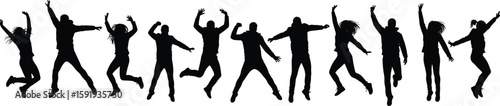 Title: "Joyful Jumping Silhouettes: Energetic Crowd Celebrating Success, Happiness, and Freedom in a Dynamic Row, Perfect for Positive Emotion and Group Achievement Concepts.