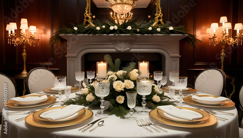 lavish, upscale, elegant, fine dining, centrepiece, candle, wine glass, silverware, opulent, stylish, celebration, ornate, high-end, tableware, napkin, candlelight, plate, social gathering, exclusive