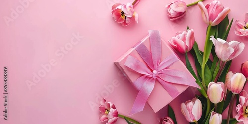 Title: Mother's Day concept. Top view photo of stylish pink giftbox with ribbon bow