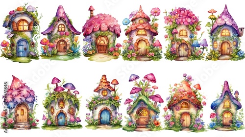 Title watercolor style cartoon illustration of fable fairytale mushroom house village with blossom flower isolated on white background, collection set, Generative Ai