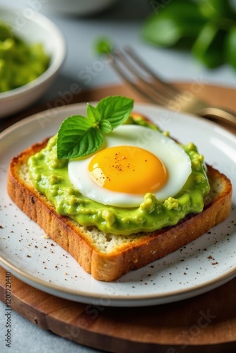 Toast with golden crispy edges and creamy green guacamole on top, a perfectly cooked egg in the center , appetizer, guacamole