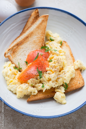 Toasts with scrambled eggs and smoked salmon served in a blue and white plate, vertical shot, middle closeup, selective focus