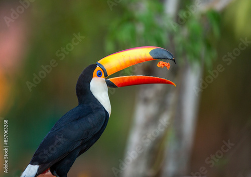 Toco toucan (Ramphastos toco) is eating fruit on a tree branch. Brazil. Pantanal.