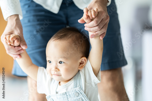 toddler baby learning to walk and having support by family together, little child with father and mother at home with first step to walking by help and holding hand from dad, happy childhood help care