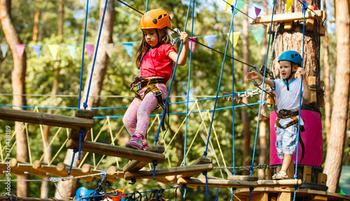 Toddler boy and girl climbing on ropes of a equipment on a playground in the summer