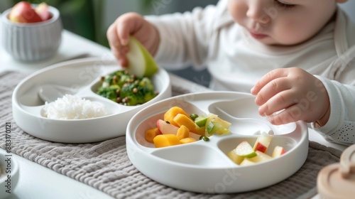 toddler, children, baby, eating, food, fruit, rice, vegetable, plate, meal, mealtime, hand, finger, table, chair, sitting, dining, home, kitchen, nourishment, healthy, development, growth, healthy snack