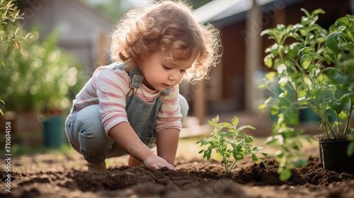 Toddler Planting a Seedling in Sunlit Garden