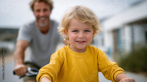 Toddler Riding Balance Bike with Cheerful Dad in Daylight Scene