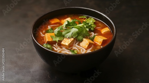 tofu, soup, noodle, bowl, cilantro, garnish, food, asian cuisine, vegetarian, vegan, healthy eating, asian cuisine, broth, vermicelli, coriander, fresh, closeup, still life, studio shot, food photography, culinary, cookery, meal, dinner, lunch, main course, delicious, tasty, flavorful, savoury, oriental, traditional, gastronomy, receipe, asian, nourishment, dark background, minimal, simple