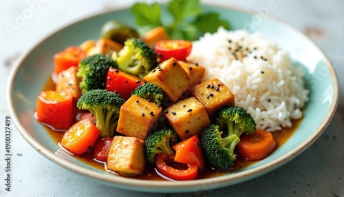 Tofu stir fry with broccoli, carrots and bell peppers. Served with steamed white rice. Healthy vegetarian meal with asian influences. Colorful dish prepared in sauce.