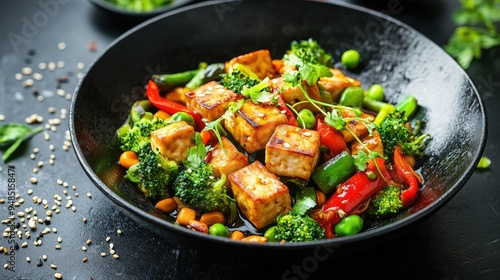 Tofu stir-fry with vegetables, high in plant-based protein, served in a wok