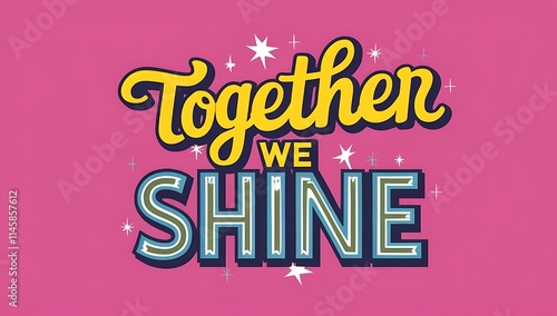 together, we, shine, bright, positive, motivational, inspirational, typography, lettering, design, graphic, art, poster, quote, saying, word, message, text, font, style, retro, vintage, colourful, vibrant, yellow, teal, green, pink, background, star, sparkle, gleam, glow, optimism, hope, oneness, strength, collaboration, teamwork, success, achievement, future, dream