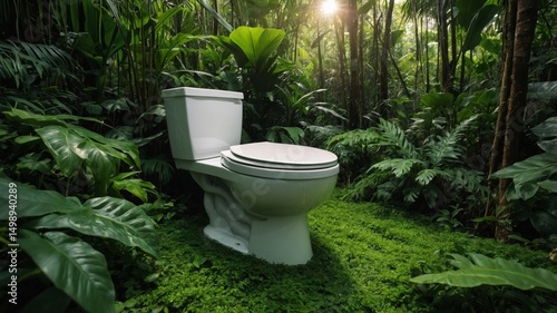 Toilet throne amidst lush jungle foliage