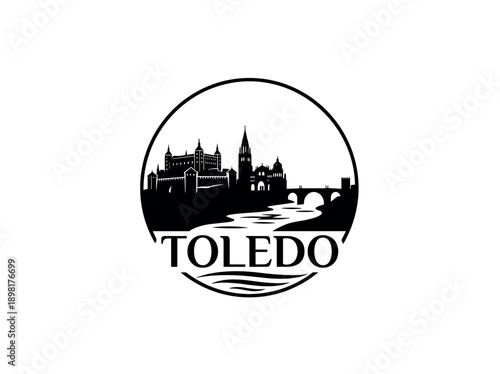 Toledo city of Spain stylized black and white skyline logo with iconic architecture