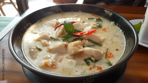 thai, soup, coconut, chicken, chili, bowl, dish, food, cookery, asian, oriental, white, vegetable, plate, meat, meal, healthy, broth, delicious, lunch, dinner, hot, cooked, cooking, travel