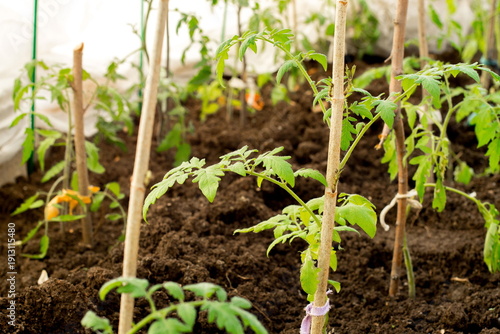 Tomato plants being grown in a greenhouse with soil and support sticks in daylight hours