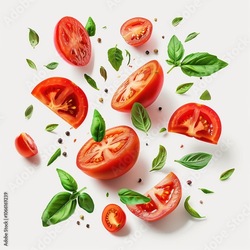 Tomato with half slices falling or floating in the air with green leaves isolated on a whote background