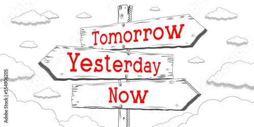 tomorrow, yesterday, now, time, schedule, planning, signpost, crossroad, guidepost, signs, three, arrow, direction, cloud, pointer, sky, outline, cartoon, wooden, text, word, concept, white, drawing, vignetting, white background, red, illustration