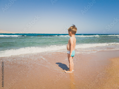 Toned image of 3 years old toddler boy standing on the sea beach and looking at horizon. Child relaxing and having good time during summer holiday vacation.