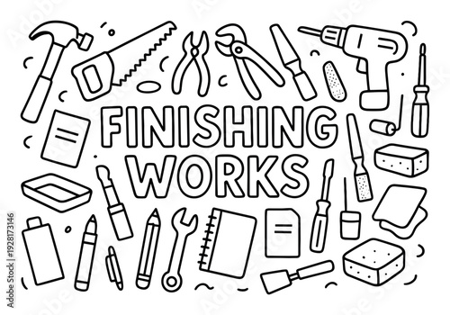 hand-drawn, tool, doodle, art, cutter, sponge, notebook, pen, crayons, marker, wrench, card, plier, board, chisel, rasp, clothes, file, knife, racked, hammer, roller, brush, folder, tray, screwdriver, tool, drill, saw, minimal, isolated, icon, vector, simple, filled, flat, graphic, pictogram, glyphs, black