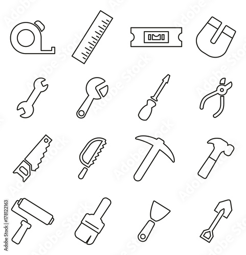 isolated, outline, wrench, white, bolt, tool, concept, line, vector, drill, helmet, trowel, nipper, service, hammer, black, shovel, simple, screwdriver, equipment, box, flat, icon, cutter, illustration, collection, toolbox, web, chisel, design, saw, group, object, maintenance, tape, plier, spanner, thin, work, instrument, repair, silhouette, magnet, man, construction, measure, work tool