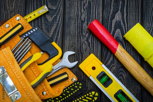 Tools in the bag for carpentry and accessories on a wooden black vintage background.