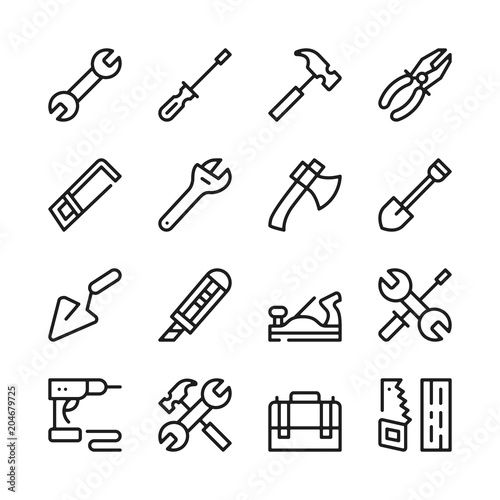 icon, tool, line, repair, instrument, set, thin, fix, working, wrench, spanner, toolbox, construction, screwdriver, plier, hammer, equipment, shovel, hatchet, screwdriver, trowel, industry, drill, carpenter's shop, wood, carpenter's shop, building, outline, simple, flat, logotype, design, element, graphic, vector, stroke, web, signs, symbol, illustration, knife, cutter, axe, adjustable, saw, handsaw, hacksaw, box, hand