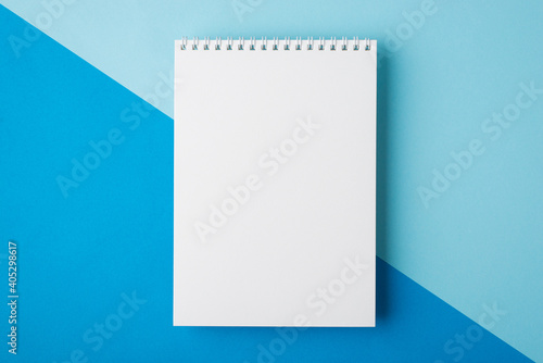 Top above overhead close up flat lay view photo of clear notebook with space for text design isolated half pastel and bright color backdrop